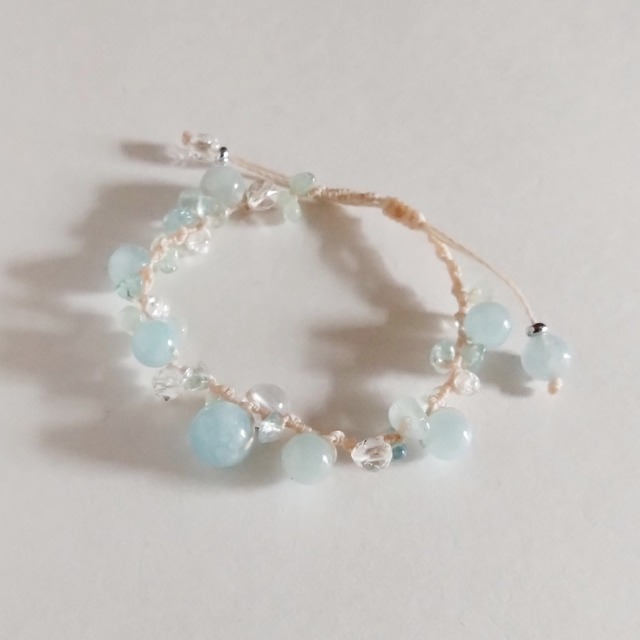 アクアマリンのマクラメブレスレットです。 ◆使っている石◆ ◾︎アクアマリン 約11mm、8mm ◾︎アクアマリン 細石 ◾︎クラック水晶 約4mm ◾︎水晶スターカット 約6mm エンド部 水晶スターカット 約6mm、アクアマリン約8mm ◆ブレスレットサイズ◆ 一番小さくして約16cmになります。 ◆紐◆ 素材:ポリエステル LINHASITA社のワックスコードを使っています。 ◆お手入れ、その他◆ 特別なお手入れは必要ありません。 指紋などの汚れが気になる場合は柔らかい布やティッシュペーパーで拭いてください。 天然石を使っているため見えない亀裂により少しの振動により割れることもございます。 硬いものに当てたり、落としたりしないようにご注意ください。 ご覧頂く機種、環境により色合いが違うことがございます。 #マクラメ #ワイヤー #ブレスレット #イヤリング #ピアス #アクアマリン #天然石 #通販