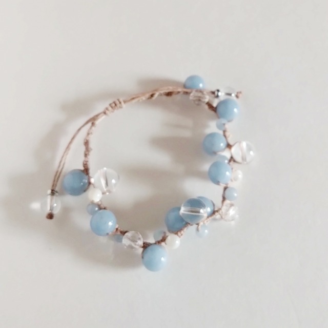 淡いブルーが美しいエンジェライトに透明感抜群の水晶タンブルを合わせたマクラメブレスレットです。 【使っている石サイズ】 ・エンジェライト:約8mm ・水晶 タンブル:約8~12mm ・エンド部分:スターカット水晶 約6mm 【ブレスレットサイズ】 1番小さくして16cm ◆お手入れ◆ 特別なお手入れは不要ですが水や汗に濡れた際は柔らかい布で拭いてください。 ◆ご注意◆ 天然石は見えないクラックなどにより衝撃でかけたり割れることがあります。 落下やぶつけることのないよう取り扱いにはご注意ください。 ご覧頂く機種、環境により色合いが違うことがございます。