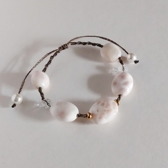 トムソナイトのブレスレットです。 ◆使っている石◆ ◾︎トムソナイト 約12.3~19×8,8×12mm ◾︎スターカット水晶 約6mm ◾︎淡水パール(ピンク) 約7mm ◆ブレスレットサイズ◆ 一番小さくして約16cmになります。 ◆紐◆ 素材:ポリエステル LINHASITA社のワックスコードを使っています。 ◆お手入れ、その他◆ 特別なお手入れは必要ありません。 指紋などの汚れが気になる場合は柔らかい布やティッシュペーパーで拭いてください。 天然石を使っているため見えない亀裂により少しの振動により割れることもございます。 硬いものに当てたり、落としたりしないようにご注意ください。 ご覧頂く機種、環境により色合いが違うことがございます。 #マクラメ #ワイヤー #ブレスレット #イヤリング #ピアス #トムソナイト #ピンクラリマー #淡水パール #天然石 #通販