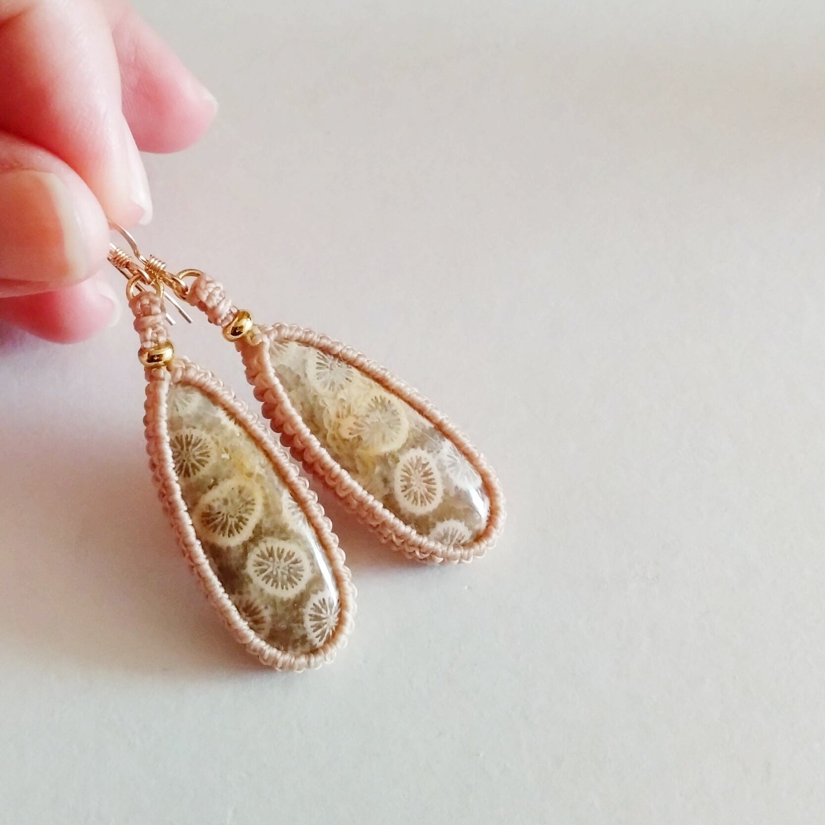 フォッシルコーラル マクラメピアス